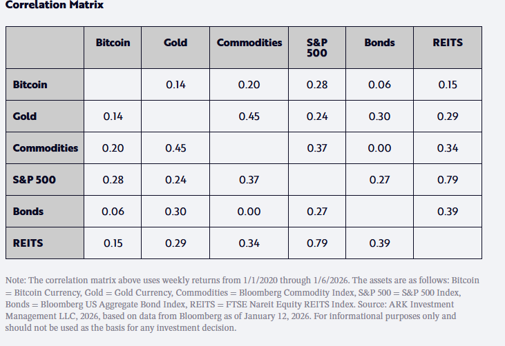 In Ark Invest’s 2026 Outlook released this week, Wood highlighted Bitcoin’s historically low correlation with traditional asset classes. According to Ark’s data, Bitcoin exhibited a correlation of just 0.14 with gold and 0.06 with bonds over the last five years.